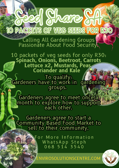 Enviro Solutions Centers' (ESC) flagship program "Seed Share SA" distributes vegetable, herb and flower seed packs at a subsidized price (R30 per 9 pack of seeds) to groups of food gardeners working together enabling them to “Grow More Food” and host a Community Food Market. We do this through a community representative (or Seed Distributors). This person is responsible for: submitting the information we need to register their group, coordinate gardeners, host monthly meetings and community markets.